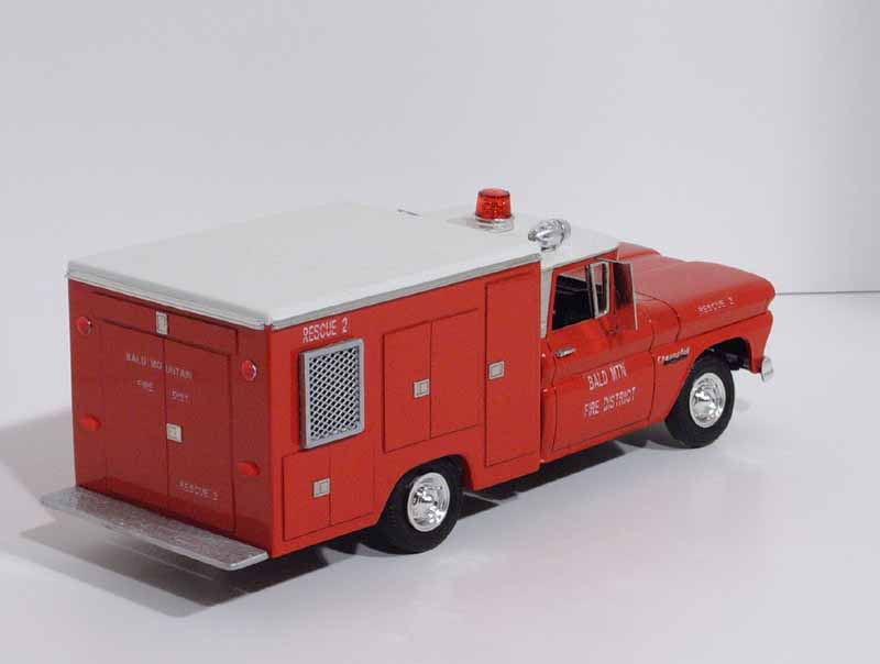 I used the AMT 1/25 scale 1960 Chevrolet Custom Fleetside for the cab and chassis. The rescue body is scratch built from styrene with resin and PE detail parts.