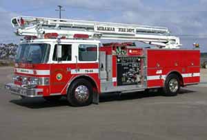 Another hybrid is the Telesquirt or just Squirt, this is an engine with an elevating nozzle, but as these usually also include a lightweight ladder on the boom Squirts can easily be mistaken for a Quint (more on Quints under the Trucks section below). The feature that sets a Telesquirt apart from a Quint is the number of ladders carried. Telesquirts usually only carry a few ladders like an engine, trucks carry a much larger selection. The elevating device ranges from 40 to 85 feet fully extended, 50 feet being a common length. Quads and Quints are also related to engines but these will be discussed under the Truck section.