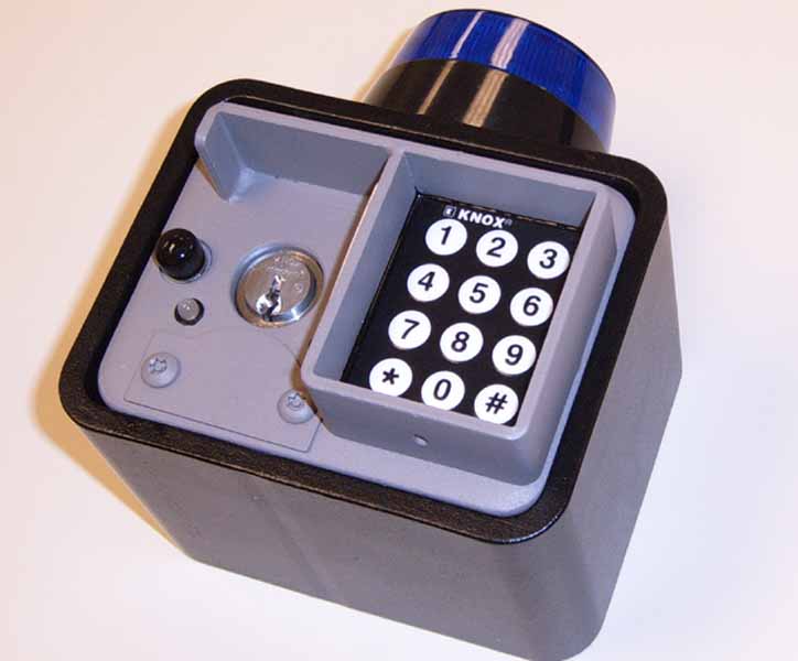 Some departments have a special key allowing them to access commercial buildings without forcing entry. These keys are stored in a code protected box generally kept in the cab of a vehicle. The light mounted on the box indicates the key has been removed.