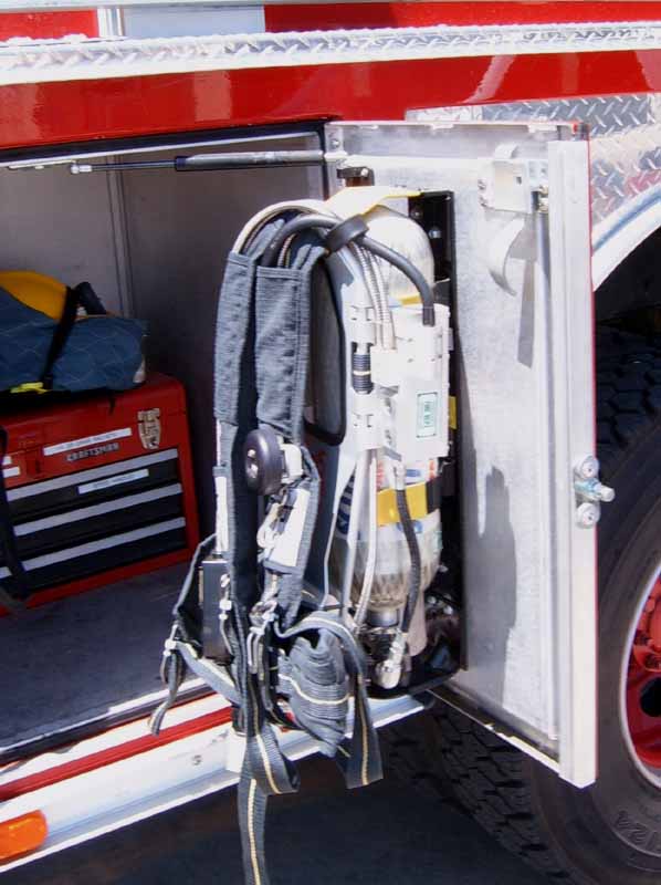 Breathing apparatus is generally stored in the cab and special seats are available allowing firefighters to wear the SCBA while riding in the seat. The drivers breathing apparatus is often stored in a compartment near the cab. Not all apparatus provide easy mounting for breathing apparatus in the cab, so another popular place is in a compartment. This is particularly common in commercial cab apparatus and smaller vehicles, it was also a common practice on vehicles designed in the 1960's and 70's since this was the period when the use of breathing apparatus was becoming more of an accepted standard but its use was not universal. In addition to the breathing apparatus, vehicles are supposed to carry at least one extra air cylinder for each air pack. Some vehicles have small doors covering storage tubes for air cylinders, the space above the wheel wells is a popular for this type of storage.