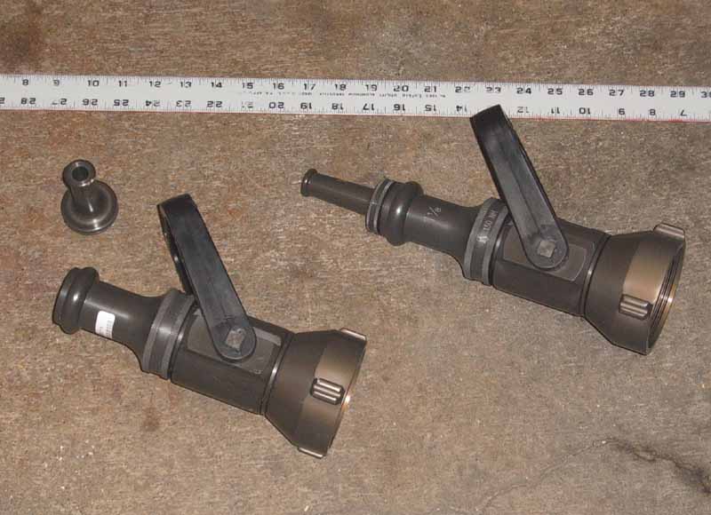 nozzle on a play-pipe (dual handles), and a 1.5" combination fog